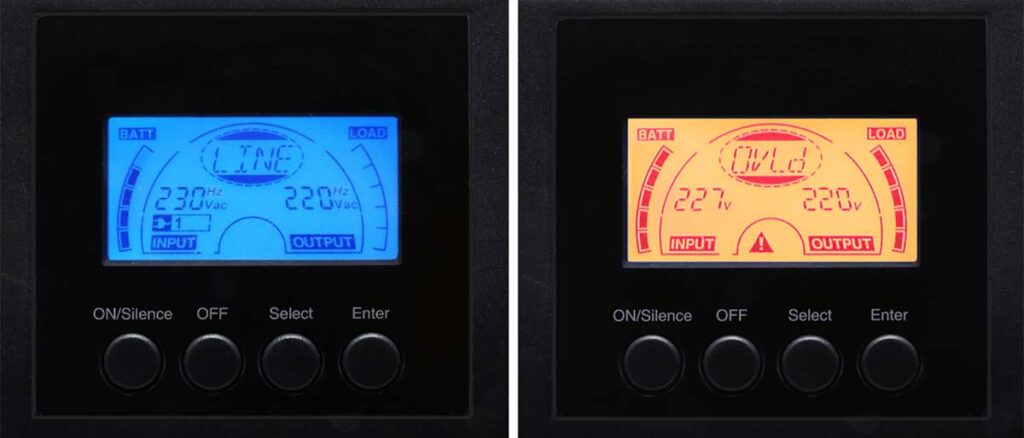 หากอุปกรณ์ไฟฟ้าที่เชื่อมต่อกับเครื่องสำรองไฟฟ้า (UPS) ใช้พลังงานไฟฟ้ามากเกินกว่าที่เครื่องสำรองไฟฟ้าจะจ่ายให้ได้ ก็จะเกิดภาวะ Overload หรือเกินกำลัง หน้าจอ LCD จะปรากฏตัวอักษร OVLd พร้อมเปลี่ยนสีหน้าจอเป็นสีส้ม นั่นหมายความว่า คุณควรถอดปลั๊กเครื่องใช้ไฟฟ้าบางตัวที่ไม่มีความจำเป็นต้องใช้กระแสไฟฟ้าสำรองหากเกิดไฟฟ้าดับขึ้นออกไปบ้าง