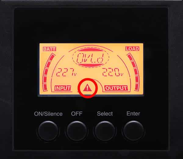 เมื่อเครื่องสำรองไฟฟ้า (UPS) เกิดความผิดปกติขึ้น บนหน้าจอ LCD จะปรากฏสัญลักษณ์เครื่องหมายตกใจในสามเหลี่ยมขึ้น เพื่อให้คุณทราบว่าต้องตรวจสอบหาสิ่งผิดปกติที่เกิดขึ้นอย่างเร่งด่วน