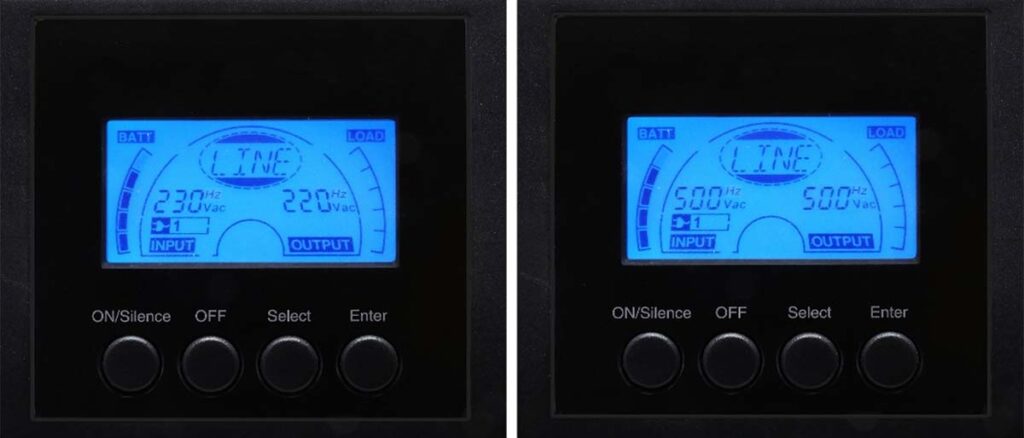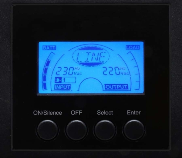 เมื่อเครื่องสำรองไฟฟ้า (UPS) อยู่ในสภาวะปกติหรืออยู่ใน Line mode แหล่งจ่ายไฟฟ้าหลักทำงานเป็นปกติ ไม่ได้มีการดึงกระแสไฟฟ้าสำรองมาใช้ หน้าจอ LCD จะแสดงตัวอักษร LINE