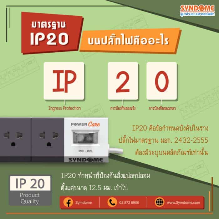 ค่า IP 20 คือข้อกำหนดบังคับในรางปลั๊กไฟมาตรฐาน มอก. 2432-2555 ที่ต้องระบุค่านี้เอาไว้บนผลิตภัณฑ์ตามกฎหมาย โดยค่าสัญลักษณ์นี้มีความสำคัญอย่างยิ่ง เพราะบอกว่าอุปกรณ์ปลั๊กไฟชิ้นนี้สามารถทนทานต่อแรงสัมผัสหรือแรงกระแทกและทนน้ำได้มากน้อยแค่ไหน โดยตัวอักษรและตัวเลขมีความหมายและบอกค่าที่แตกต่างกันไป